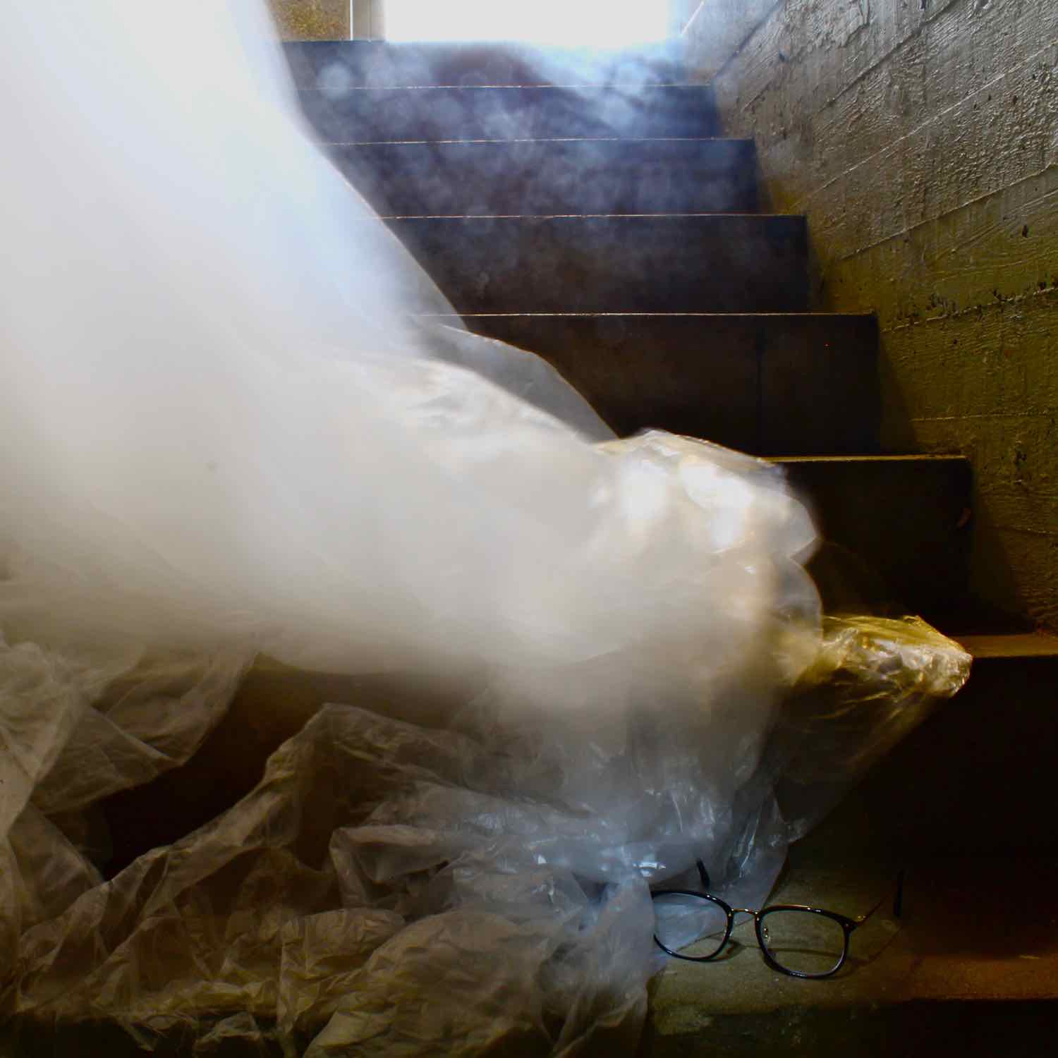 An die Installation sind wir zunächst ohne besonderes Ziel gegangen. Irgendwann kam uns die Idee eine Art Malerarbeit zu inszenieren. Dafür haben wir die ganze Treppe mit weißem Stoff bedeckt, eine Malerfolie drüber gelegt und gelbe Gummihandschuhe und Pinsel auf der Treppe verteilt. Wir haben drauf los fotografiert und nach ein paar Versuchen kam uns die Idee, die Pinsel und Handschuhe zu entfernen und ein weißes Stück Stoff durch das Bild fliegen zu lassen. Dabei haben wir mit der Belichtung experimentiert. Daraus entstand eine geisterhafte, irgendwie geheimnisvolle Inszenierung, die uns gut gefallen hat.